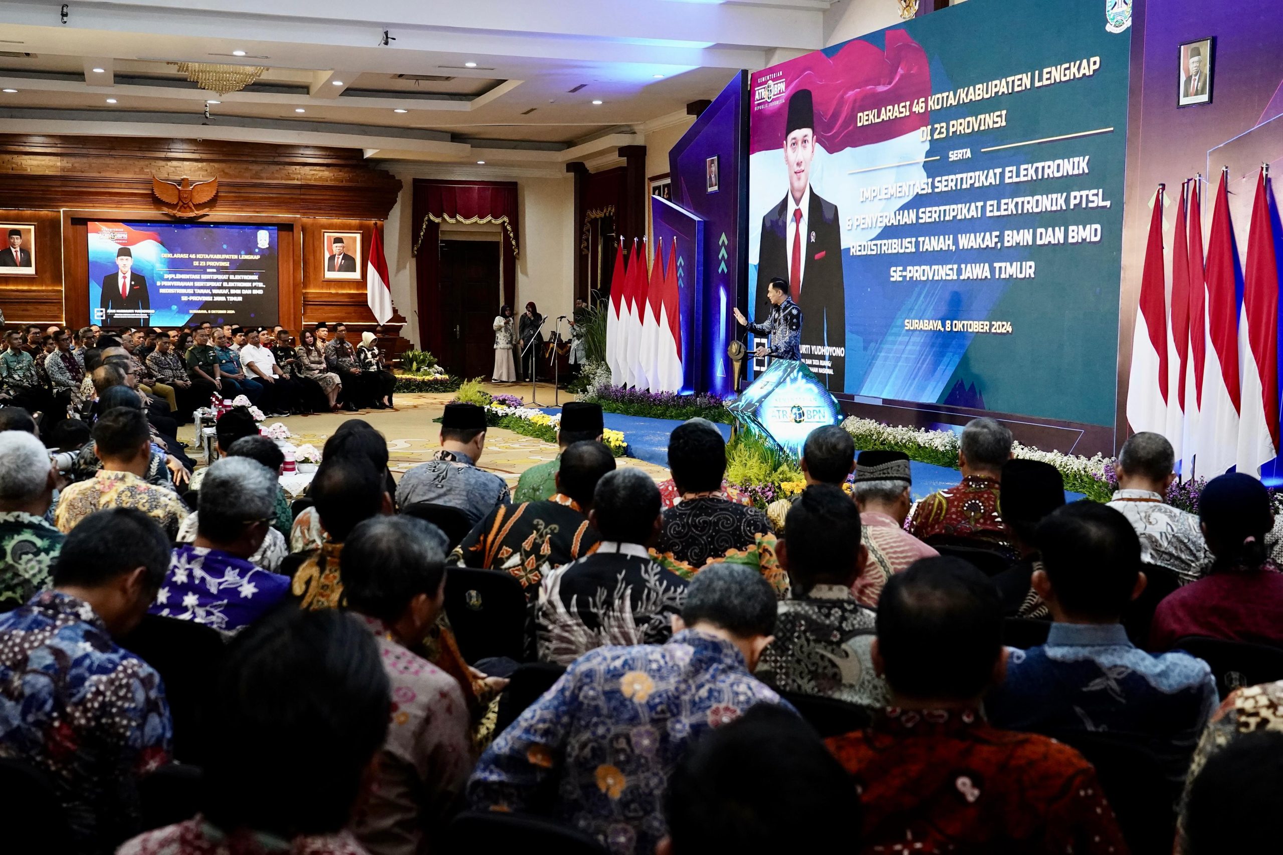 “Mari kita terus kejar target pencapaian sampai dengan akhir tahun ini, mudah-mudahan tercapai 104 Kota/Kabupaten Lengkap bahkan bisa over prestasi. Contoh di Jawa Timur ada beberapa tambahan termasuk Pacitan yang sebelumnya tidak masuk list yang diprioritaskan. Ini contoh, dengan kerja keras dan kerja bersama, bisa dilakukan itu semua,” kata Menteri AHY dalam sambutannya di Gedung Negara Grahadi Jawa Timur, Kota Surabaya.